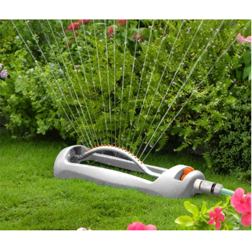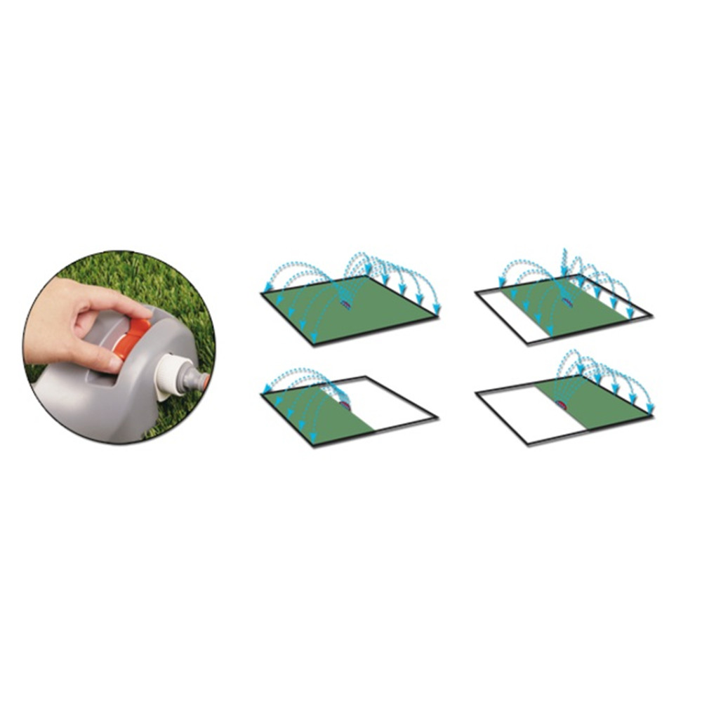 Alumínium karú, 18 fúvókás oszcilláló locsolófej. Egyszerűen és könnyen állítható az öntözött terület mérete. A fúvókák tisztításához műanyag tűt mellékeltek. 334 m2-t locsol be.